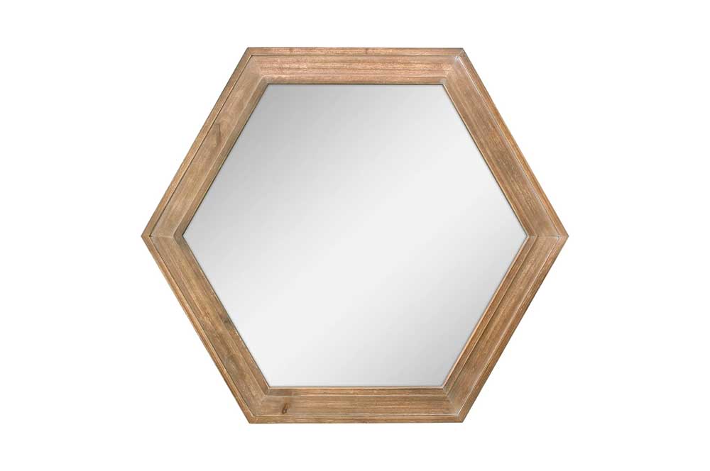 Featuring a crystal clear reflection and a rustic wooden hexagon frame with a natural finish, this mirror gives off a vintage farmhouse feel that is both warm and inviting. The wooden hexagon frame adds a unique touch of character to the mirror, making it a perfect addition to your bathroom, living room, bedroom, office, or entryway.