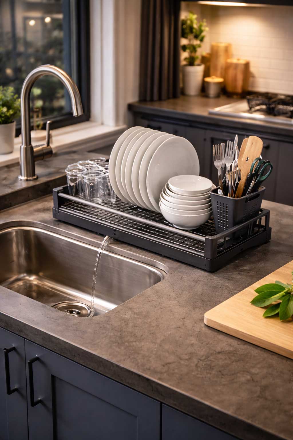 A good compact dish rack should include a drainboard or allow water to flow directly into the sink. Proper drainage prevents puddles, protects countertops, and keeps the kitchen cleaner.