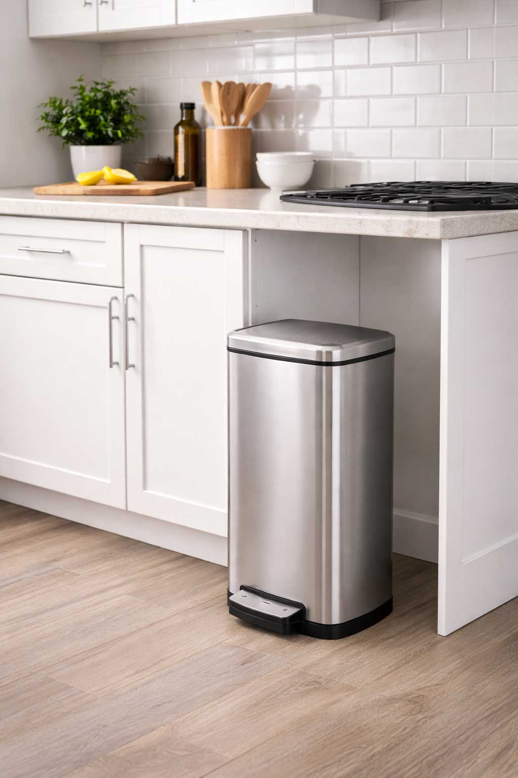 Start by measuring the area where the trash can will go. Slim rectangular cans work well beside cabinets or appliances, while under-sink or cabinet-mounted options are ideal for kitchens with very limited floor space.